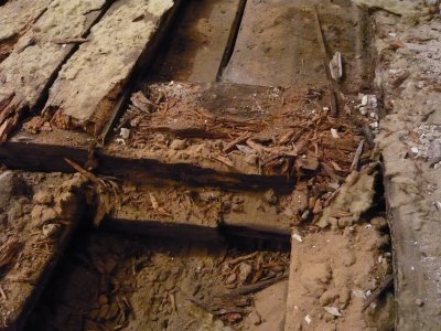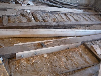 Zwischen den Balken sind lose Bretter aufgelegt die mit feinem Sand bedeckt sind. Wir vermuten, dass es für Schalldämmung gemacht worden ist. Normal wäre es gewesen, alles auszufüllen, dann wäre die Decke aber zu schwer geworden. Hohlkörper, die jetzt drinnen sind, erzeugen allerdings einen Klangkörper und verstärken den Schall. Sei's drum, ich werde den Raum mit Mineralwolle ausfüllen.