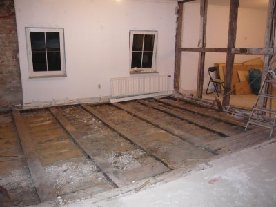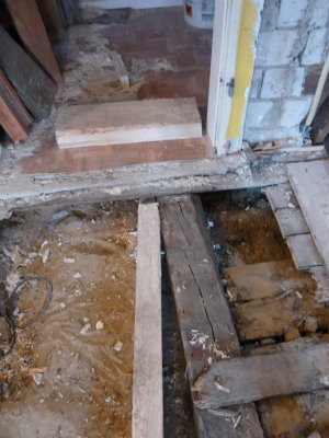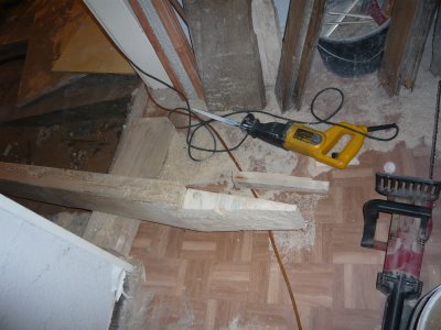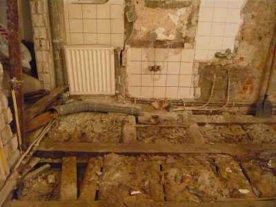 In der ganzen Ecke muss der Boden raus. Da soll das neue Bad mit einer Fussbodenheizung entstehen. Vorne sind die vergammelten Bretter schon entfernt. Die Frage ist jetzt, ob es sinnvoll ist, den ganzen Boden in dem Raum zu entfernen, damit Estrich und der neue Holzboden tiefer und gerader werden. Das kann teuer werden und dauert natürlich länger.