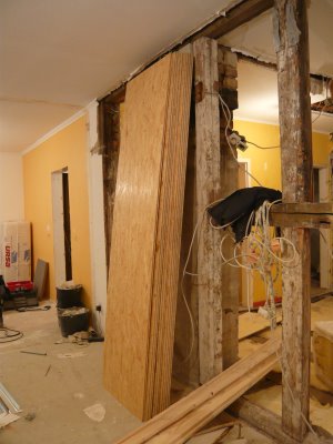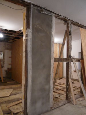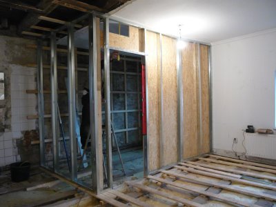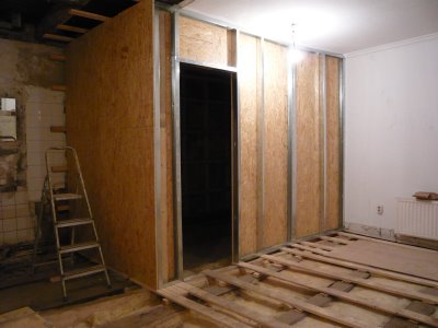 Leichtbauwaende sind ne tolle Erfindung. Hier entsteht gerade das Bad. Hinten rechts ist ein rechter Winkel an der Wand, den wir spaeter brauchen, um die Badwanne richtig einzusetzen. Insgesamt haben wir die gesamte Wand um 50 cm nach hinten gesetzt, da uns das Bad zu gross erschien.