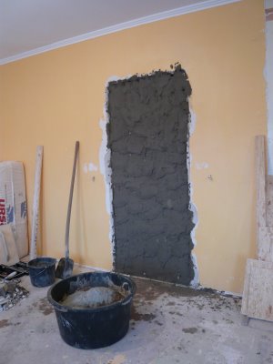 Ein Kalksandstein hat aber nur 11,5 cm Dicke und die Mauer aber 16 cm Stärke. Es mussten also von beiden Seiten jeweils 2 cm Putz aufgetragen werden.