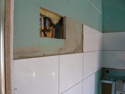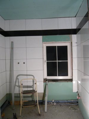 Die Fliesen sind 45*30 cm groß und werden auf 1,65 m Höhe gefliest. Das Bad ist ungefähr 2,3 Meter hoch. Links sehen wir die Anschlüsse für die Dachtterrasse, die später von einer Revisionstür verdeckt werden. Übrigens 30*30 cm Revisionstüren kriegt man nicht im Baumarkt.