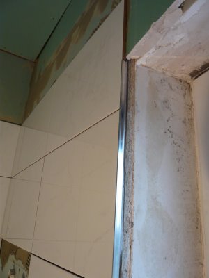 Die Kanten am Fenster, an der Stufe und bei der Waschmaschine werden mit Edelstahlleisten abgeschlossen. Diese Leisten sind richtig teuer. Ich vermute sie werden irgendwo in Sibirien in einem Edelstahl-Bergwerk von kleinen "Gimlis" ausgegraben und irgendwelche hochbezahlte Ex-Bank-Managerin polieren sie per Hand:-)