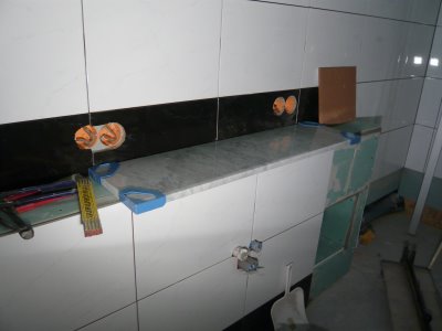 Das ist jetzt die Variation mit einer Mamorplatte. Das ist übrigens die Fensterbank, aber ich könnte ja die gleiche Platte auch als Ablage nehmen. Zuerst fand ich die Idee nicht gut, da das schwarz richtig gut aussah. Als ich die Mamorplatte hingelegt hatte, war der erste Eindruck erstaunlich gut. Jetzt nochmal ne Nacht drüber schlafen und mal sehen was der Fliesenleger meint und vielleicht krieg ich ja noch paar Kommentare (wie bei den Fliesen).