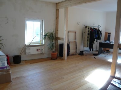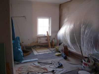 So sah es dann die letzten 8 Wochen mehr oder weniger aus. Ein paar Malersachen, die Holzbretter vom Küchenboden lagen noch rum und die Wände musste noch verputzt werden.