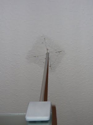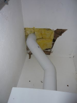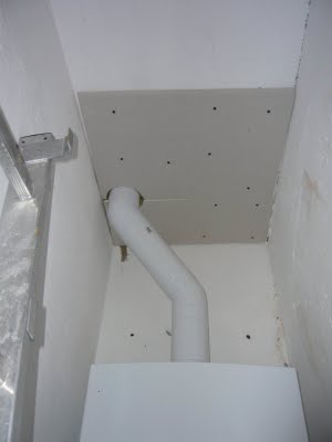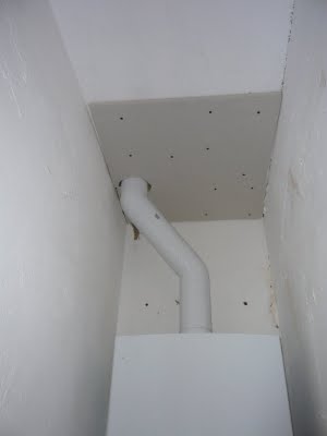 Das war wieder einmal eine dieser Restarbeiten, die ich schon vor Monaten hätte erledigen sollen. Beim Einbau der neuen Gastherme wurde auch ein neuer Abzug (ist das auch ein Schornstein?) gelegt. Er geht jetzt durch die Decke anstatt wie vorher, durch die Seitenwand. Nach den Arbeiten blieb natürlich ein Loch in der Decke zurück, was auf mich wartete.