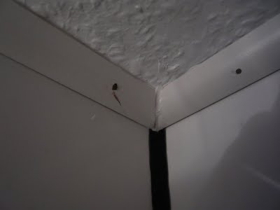 Hier sieht man die eine Leiste mit vier Nägeln und etwas weissem Silikon in die Ecke "gedrückt". Rechts sieht man noch die alte Version mit Schlitz und Fuge.