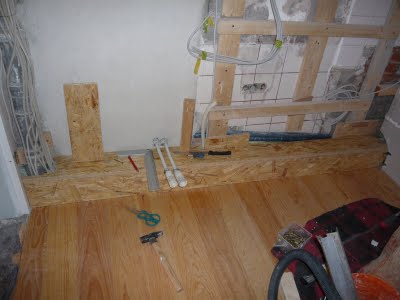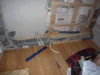 Die endlose Arbeit mit den Rohrkästen setzt sich fort. Da diese beiden Dachlatten ca 3 mm zu hoch waren, hab ich die Vorwand noch einmal abgeschraubt, beide Balken tiefer gesetzt und zur Stabilisierung noch ein altes IKEA IVAR Regal eingesetzt (erkennt man an den Löchern). Das hält jetzt bombenfest.