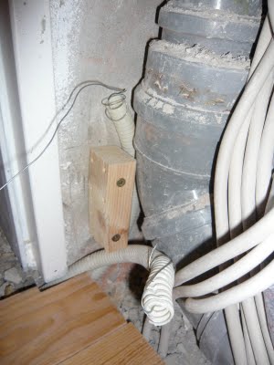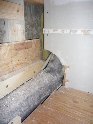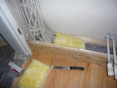 Dann wurde der Kasten mit Dämmwolle und alten Filzmatten gefüllt, damit das Abwasser nicht so laut ist und der Hohlkörper kein Klangkörper wird.