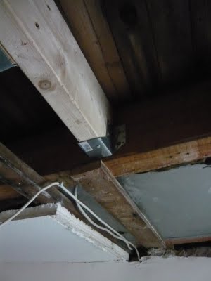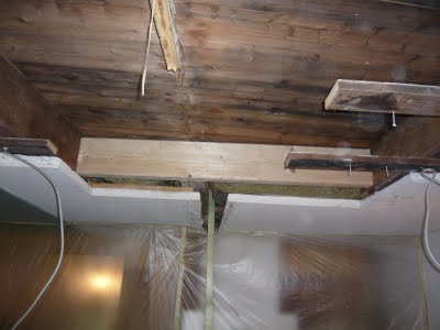 Heute sind die Handwerker im Haus. Zuerst mussten zwei Wechsel eingesetzt werden. Dieser Dachbalken aus drei einzelnen Latten sollte auf 250 cm rausgenommen werden.