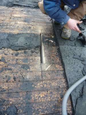 Die Säge war nach 30 cm mit Teer verklebt und den ganzen Rand mussten wir mit Stechbeiteln machen. Mit vier Mann hat das bei Regen ne gute Stunde gedauert.