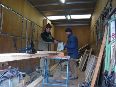 Dann wurde im geschützten LKW alle Rahmenstücke zurechtgesägt.
