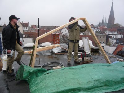 Und dann war bei Nieselregen und gefühlten 0 Grad das Loch im Dach. Jetzt kommt die Konstruktion aufs Dach.