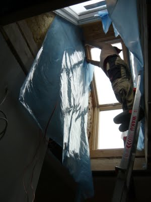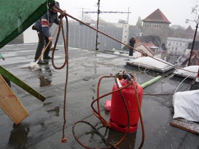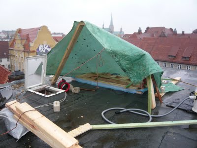 Als Wind- und Regenschutz haben wir ein Gestell und ne Plane aufgebaut, damit der Dachdecker arbeiten konnte. Arschkalt war es trotzdem aber immerhin war es darunter trocken.