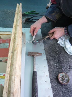 Dann wurde das schon angefertigte Zinkblech mit "Schmatze" aufgeklebt. Die Schmatze war nur zum Schutz vor dem Regen, damit nicht eine Restfeuchtigkeit einkriechen kann und die große Anazhl der Nägel sollte das Blach besonders fest andrücken.