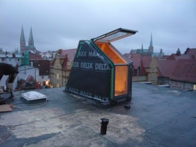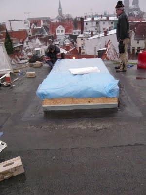Dann wurde noch ein Streifen Dachpappe drüber geklebt und damit heute Nacht nichts passieren kann, wurde noch ein Deckel raufgeschraubt. Das ganze haben wir dann noch mit einer Plane abgedeckt also keine Panik. Im Hintergrund sieht man schön die schneeweißen Dächer der Lübecker Innenstadt.