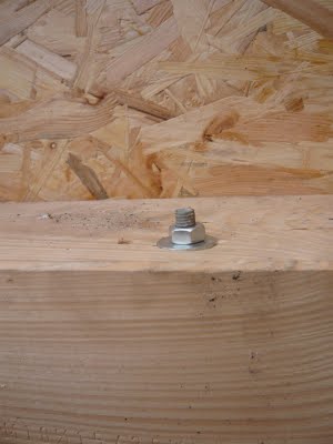 Für die Befestigug des Auflegerahmes wurde acht Bolzen gesetzt. Damit wird die obere Kostruktio mit den Dachbalken verbunden. Der Dachausstieg soll ja auch bei den Herbststürmen nicht wegfliegen. Zuerst wurde mit nem lange Bohrer durch alle Balke gebohrt.