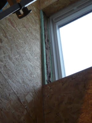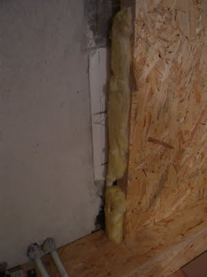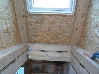Beim Fensterrahmen war rechts und links kein Platz mehr für eine OSB-Platte, daher haben wir nur schmale Leisten aufgeschraubt und etwas Dämmwolle reingetan. Verschlossen wird dies später mit Gipskarton.