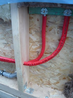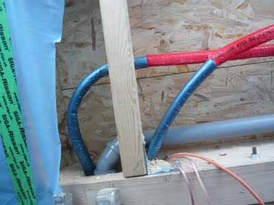 Auf die Terrasse soll später auch Warm-und Kaltwasser kommen und natürlich auch Abwasser. Wer weiss schon was später kommen wird und was da ist, kann später nicht fehlen. Die Leitungen mussten durch eine Stützbalken gestemmt werden, aber dies Hindernis wurde meisterlich genommen.