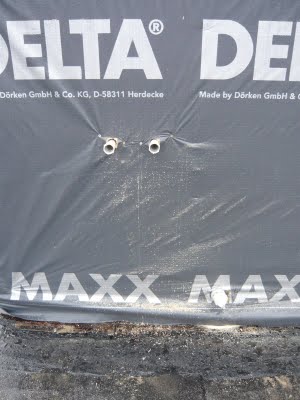 Aussen siehts dann so aus. Die Rohre sind mit Pflocks zugeschraubt und rechts unten ist das Abflussrohr. Jetzt kann der Dachdecker alles verzinken.