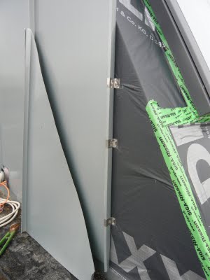 Hier sieht man die Schellen mit denen die Zinkstreifen an die Unterkonstruktion befestigt worden sind. Die ganze Verkleidung wird mehrere Tage dauern und morgen solls schon wieder regnen.