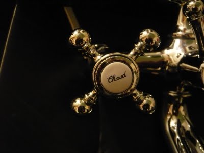 In der Nahaufnahme sieht man die französischen Bezeichnung für Warmwasser auf der Keramik. Bitte nicht wundern, dass die Aufnahme etwas Messing-Gold erscheint, das liegt am falschen Weissabgleich. Die Armatur ist silbern/chrom.