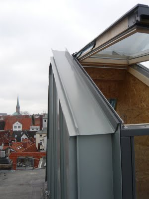 Heute ist gutes Wetter und so konnte der Dachklempner (ja so heissen die Spezialisten für Zinkarbeiten, ein Dachdecker macht was anderes) die erste Wand mit Zink verkleiden. Natürlich gehen die ersten großen Streifen wieder mal schnell, aber der Teufel steckt im Detail.