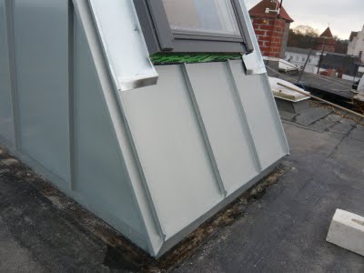 In dem guten Wetterschutz konnte der Dachdecker arbeiten und hat den Zinkrand um den Dachausstieg gelegt. Zuerst wurde der Rand trocken gelegt, bzw. der Brenner machte gute Arbeit.