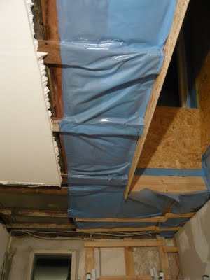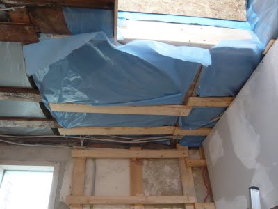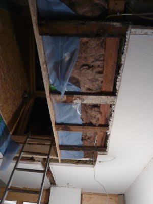 Jetzt stand die Decke bestimmt über ein Jahr offen, da sich alles verzögert hatte, aber am Wochenende ging es mir auf die Nerven. Ich hatte eigentlich keine Zeit, dennoch hab ich die Löcher in der Decke mit der Restwolle gestopft und mit den Resten der Dampfsperre versiegelt.