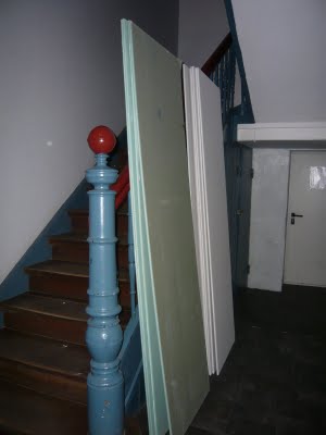 Die weissen Gipüskartonplatten sind für die Innenverkleidung des Dachausstiegs. Das sind auch noch einmal sechs Platten. Das alles muss natürlich noch in vierten Stock getragen werden. Die Hälfte ist schon oben der Rest kommt heute und morgen und dann gehts ans verbauen.
