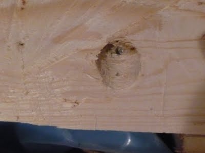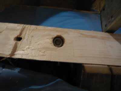 Natürlich gabs dabei Probleme und davon nicht wenige. Zum einen hatte ich keinen Bohrer um die große Unterlegscheibe mit zu versenken, aber ich hatte noch einen 20 mm Holzbohrer rumliegen (den brauchte ich damals beim Deckenbalken im Fussboden) und der reichte gerade für die kleine Unterlegscheibe. Zum anderen störte ein Nagel genau an dieser Stelle, den konnte ich aber aufwendig 4 mm rausschlagen, was mich aber einen 10 mm Holzbohrer gekostet hat.
