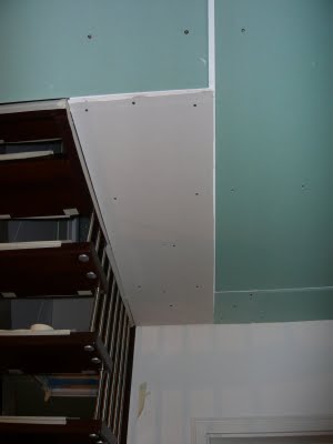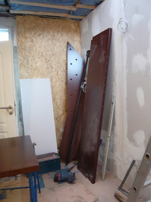 Darunter hab ich dann zwei Gipskartonplatten geschraubt. Das war natürlich aufwendig, da ich sie ja unten nicht hinstellen konnt. Das Schalbrett als Hilfskonstruktion hat dies temporär erledigt. Jetzt fehlen noch zwei Platten und natürlich die Feinarbeiten, wie spachteln und malen.