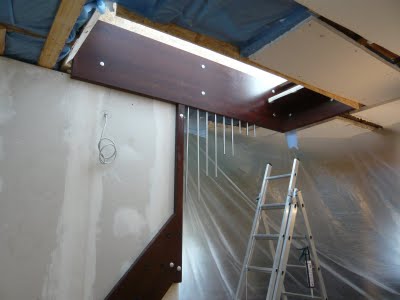 Zuerst haben wir in allen Spalten und Ecken noch kleine Hilfsbretter geschraubt, damit wir überhaupt Ansatzpunkte für Schrauben haben. Dann wurde die Decke zuerst mit Styropor und Gipskartonplatten verkleidet.