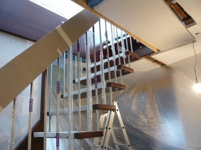 Unglaublich aber wahr :-) Die Treppe ist fertig und das alles an einem Tag und ohne Probleme. Hier der Blick nach oben über den Antrittspfosten zum Ausstieg. Die Treppe ist noch abgeklebt damit sie beim streichen nichts abkriegt und auch der Bauschmutz sie nicht zerkratzen kann.