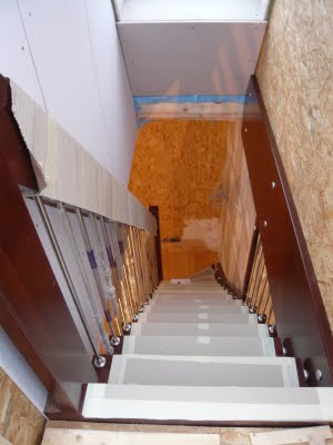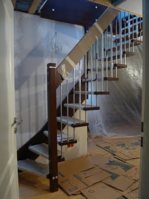 Die Treppe ist aus Buche und wird aber mit Farbe Nussbaum gebeizt (hoffe das ist jetzt korrekt). Sie hat ein Edelstahl Geländer (auch zwischen den Stufen) und ist eine hängende Konstruktion, d.h. die Treppe hängt statisch am Geländer. Links oben sieht man eine kleine "Harfe". Dort ist die Wand vom Bad zuende und die Treppe wird dann über die Decke gehalten. Das sollte eigentlich sehr luftig aussehen und bringt ne Menge Licht in die Bude. Hoffentlich wird die Treppe noch vor Weihnachten eingebaut. Ich will nämlich erst die Treppe drin haben um das Bücherregal und das Badewannenpodest farblich abstimmen zu können.