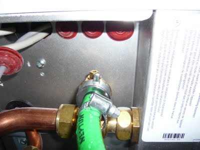 Jetzt begannen natürlich auch die Probleme, denn es ging kein Wasser in die Therme. Also noch einmal Anleitung gelesen, Schlauch kontrolliert, beide Schlauchseiten vertauscht etc. Trotzdem weigerte sich das Wasser in die Therme zu fliessen. Die untere Schraube konnte ich um 180 Grad drehen aber nichts passierte und es kam auch kein Wasser aus der Therme, egal was ich machte. Nach einem telefonischem Hinweis beim Fachmann, dann der entscheidende Tipp. Die Ventilschraube ist nicht unterm Ventil (hier nicht zu sehen) sondern sehr versteckt seitlich darüber (der kleine Messing-Vierkant über grünem Schlauch).